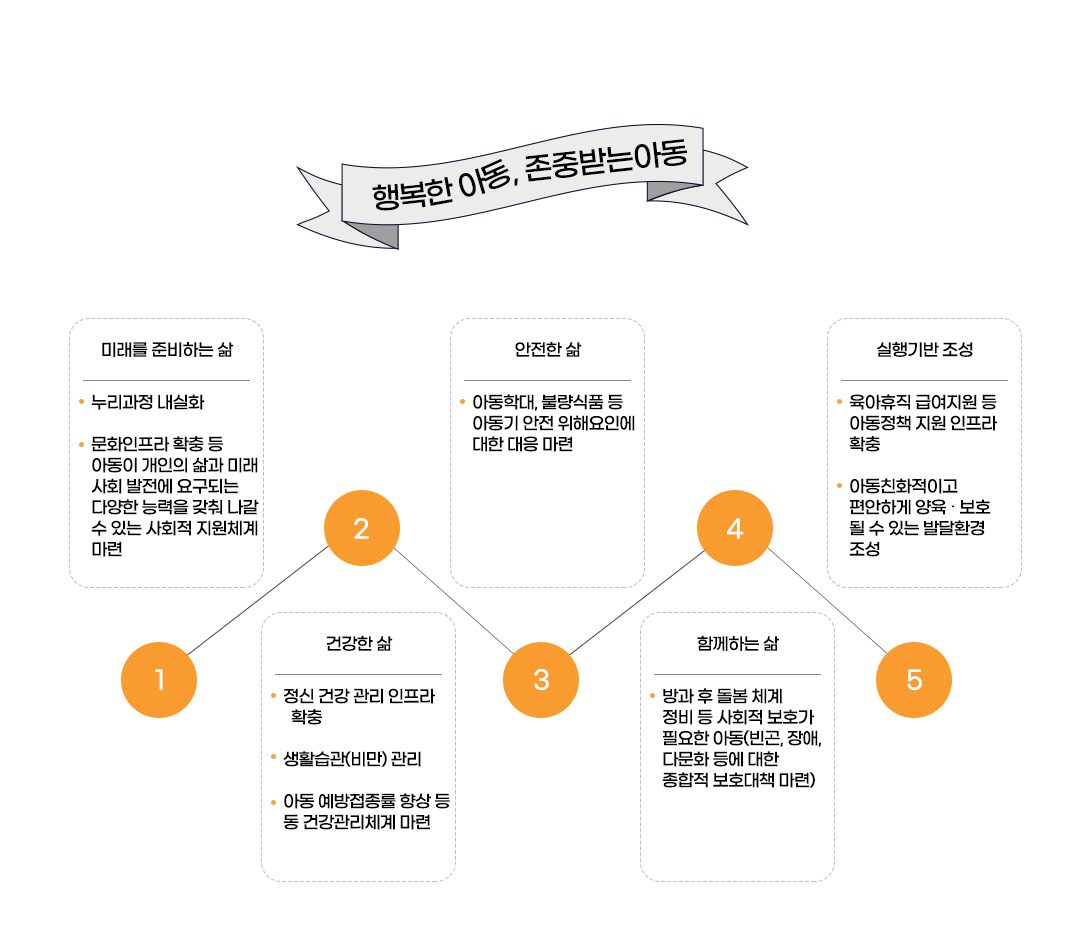 • 1. 미래를 준비하는 삶: 누리과정 내실화, 문화인프라 확충 등 아동이 개인의 삶과 미래사회 발전에 요구되는 다양한 능력을갖춰 나갈 수 있는 사회적 지원체계 마련